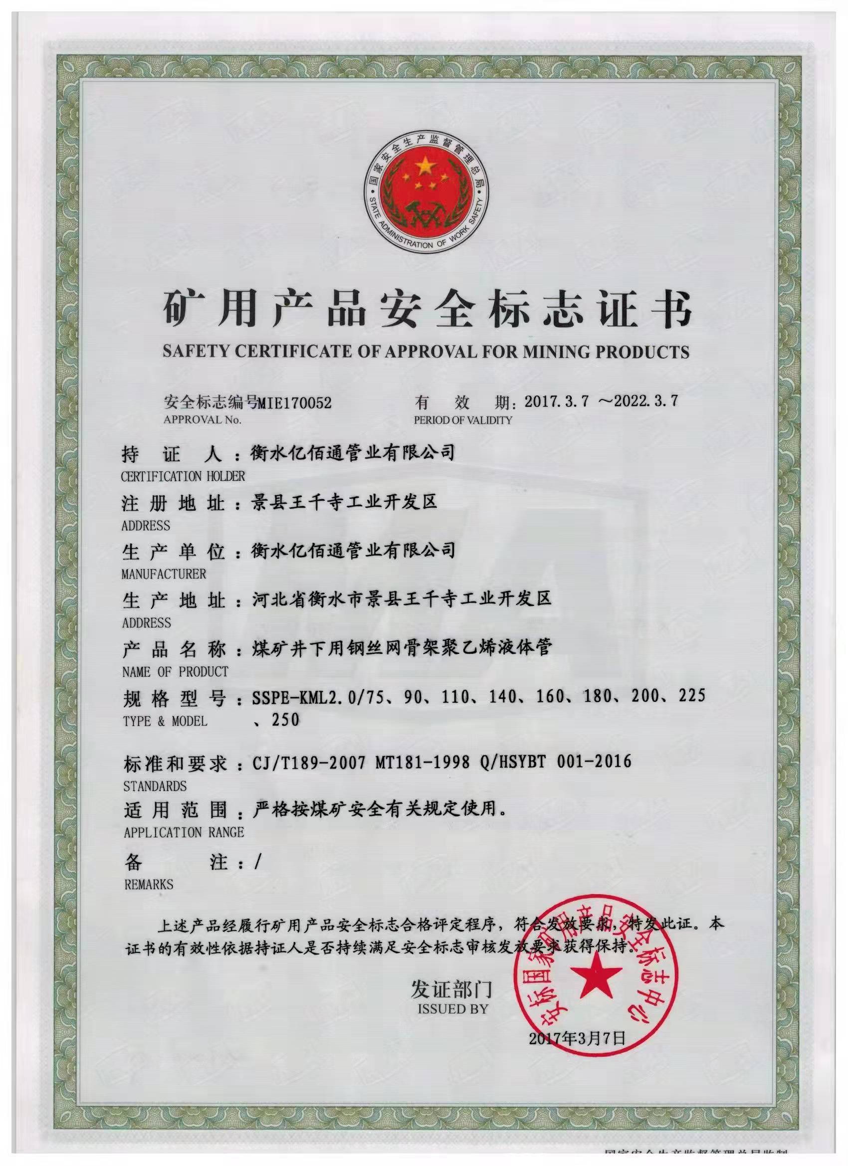 矿用产品安全标志证书